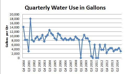 First, we have roughly fourteen years of quarterly water data. Before we even get into the use patterns, let me use this as an opportunity to rant about the bill itself. Our bills come quarterly. Shadi’s comes bi-monthly, and many utilities send theirs monthly, which allows for much more rapid feedback to problems. Communities that have begun using automated technology to alert customers to aberrant high use are way ahead of my community of Wauwatosa, Wisconsin, where a problem could run on for a very long time before being detected in an unexpectedly high bill.
