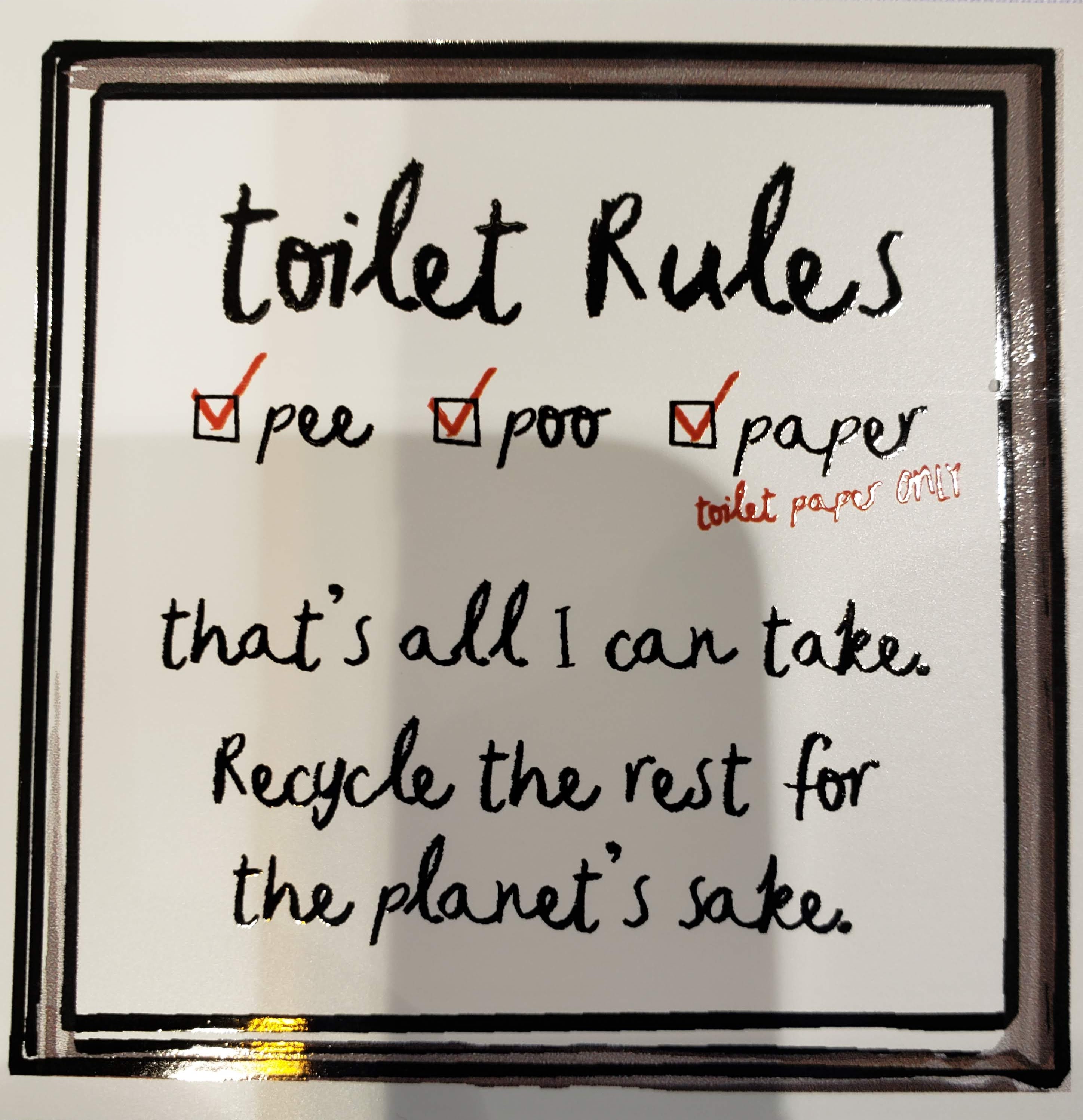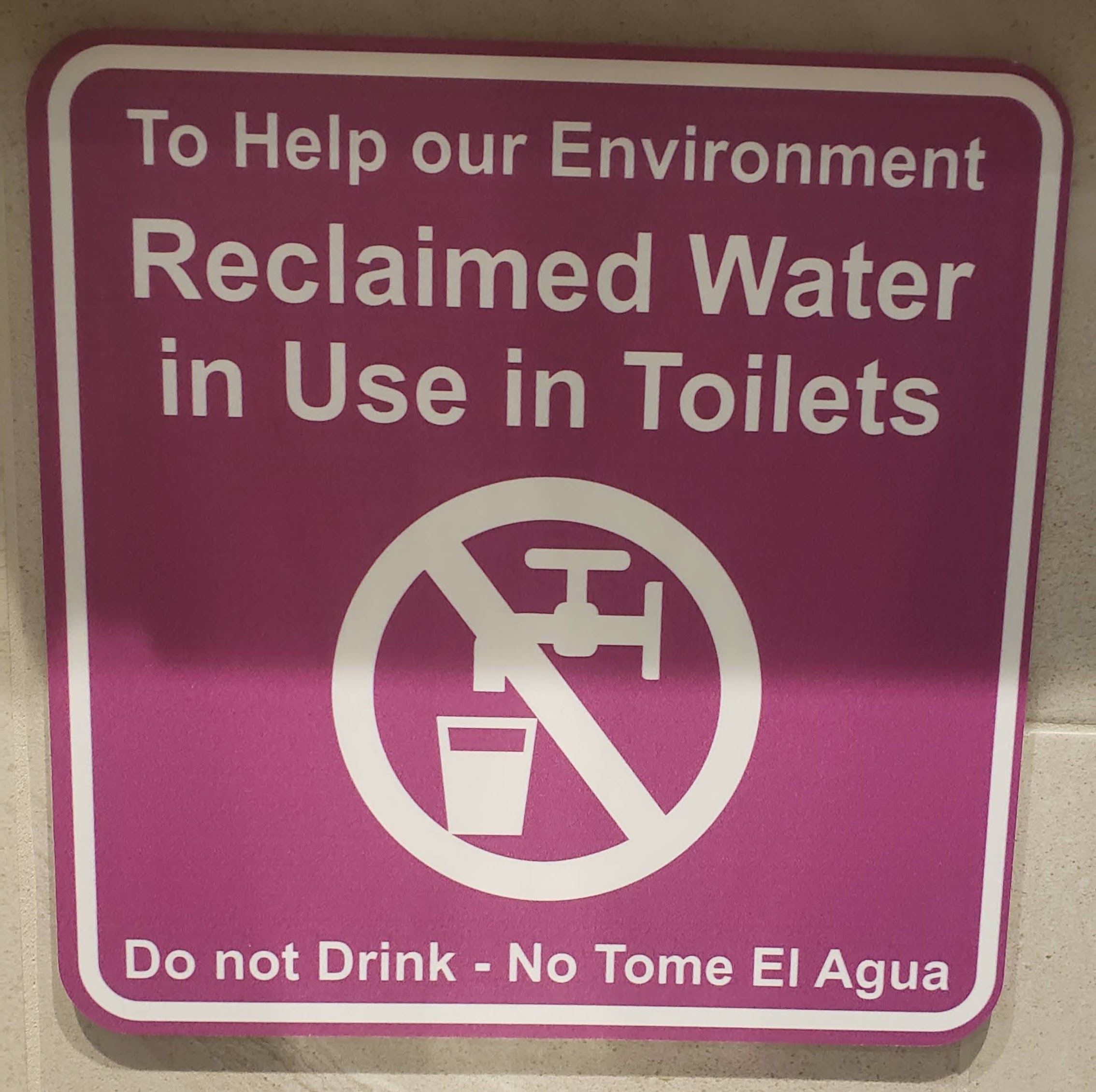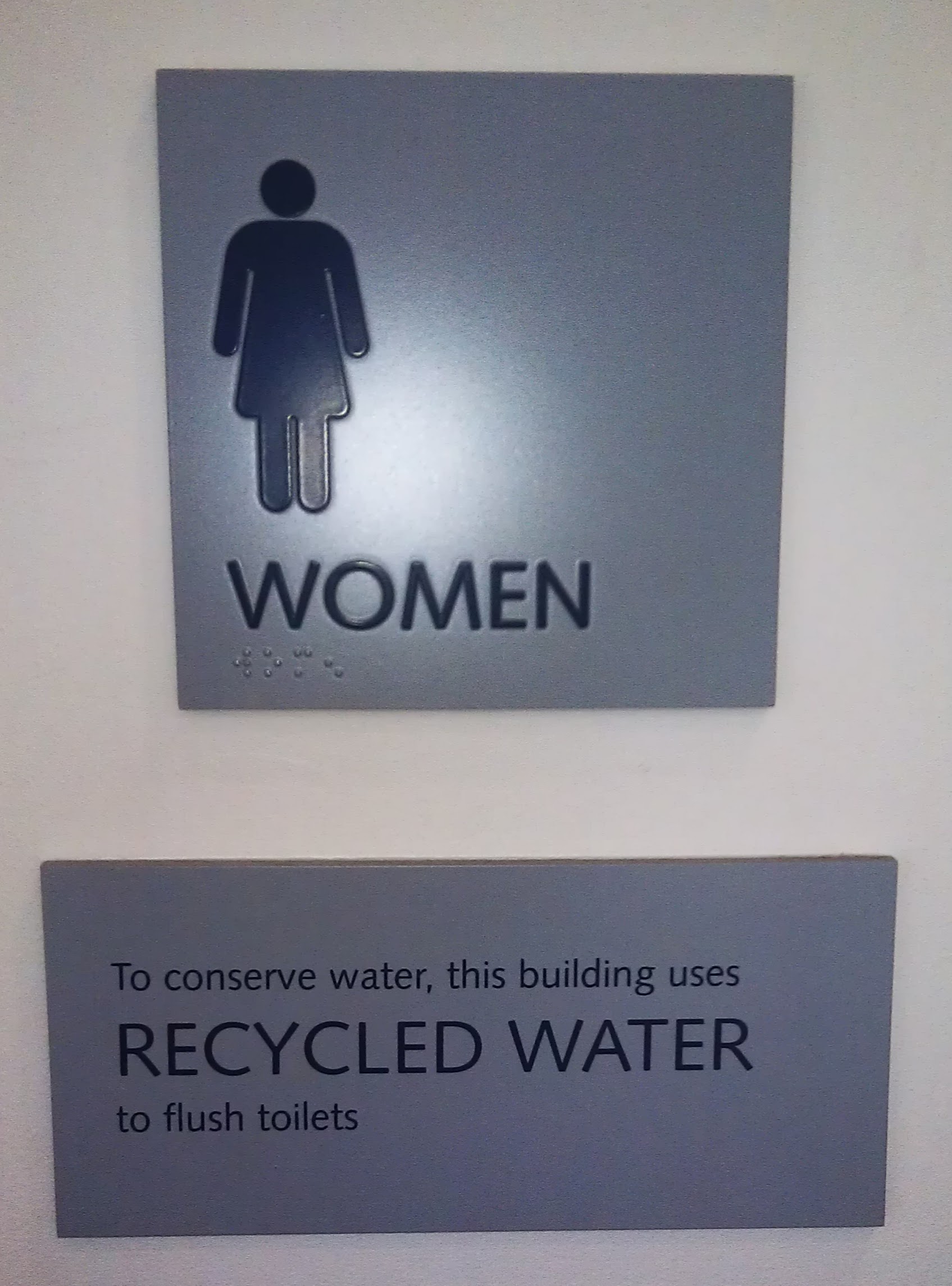 It’s increasingly frequent to encounter signs indicating that the toilets used reclaimed water or captured rainwater, and it’s nice that sometimes the signage reflects a sense of humor.