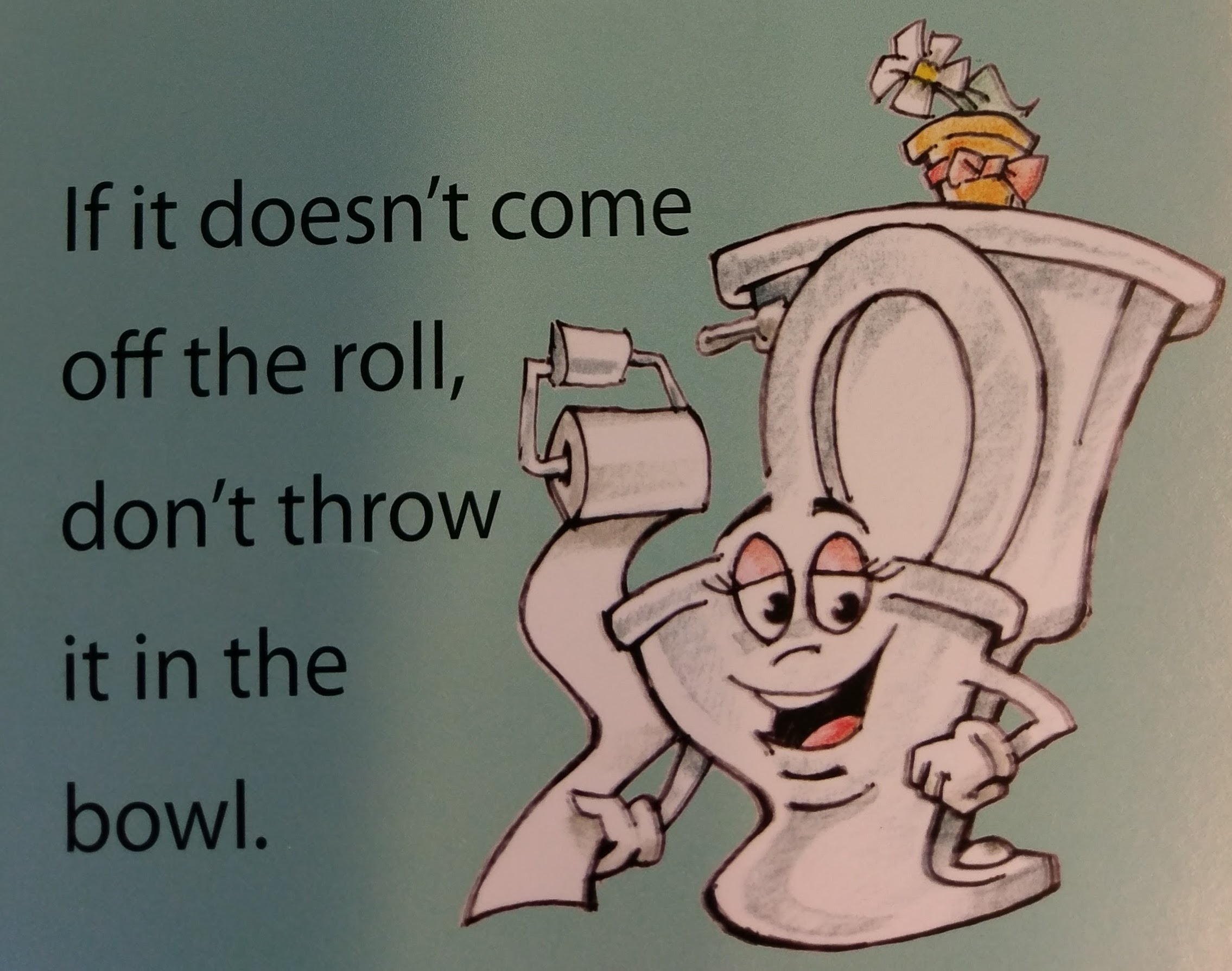 Of course, first on the list are images about what to flush or not flush. This is serious business that finally got traction thanks to the pandemic. My hairstylist is a case in point: locked up at home, having run out of toilet paper, she turned to “flushable” wipes and soon earned herself an expensive visit from a plumber along with a lecture on the flushability of wipes.